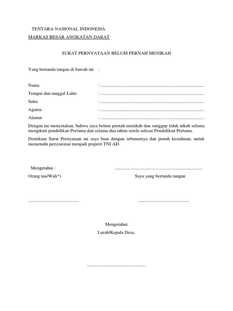 Surat keterangan belum menikah adalah surat yang menerangkan bahwa kamu belum pernah menikah alias berstatus lajang. Apa saja syarat pembuatannya ? Surat ini dapat dibuat oleh ketua rt, kepala desa/ lurah/, . Untuk membuktikan hal tersebut, biasanya suatu perusahaan akan meminta persyaratan berupa surat keterangan belum pernah menikah untuk . Surat pernyataan perkawinan belum tercatat.